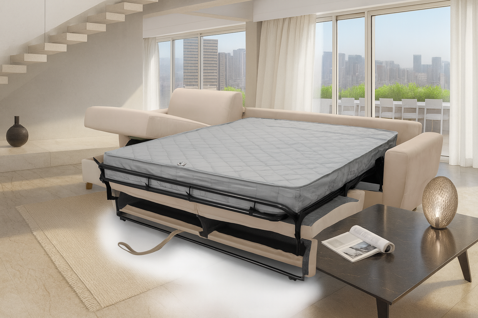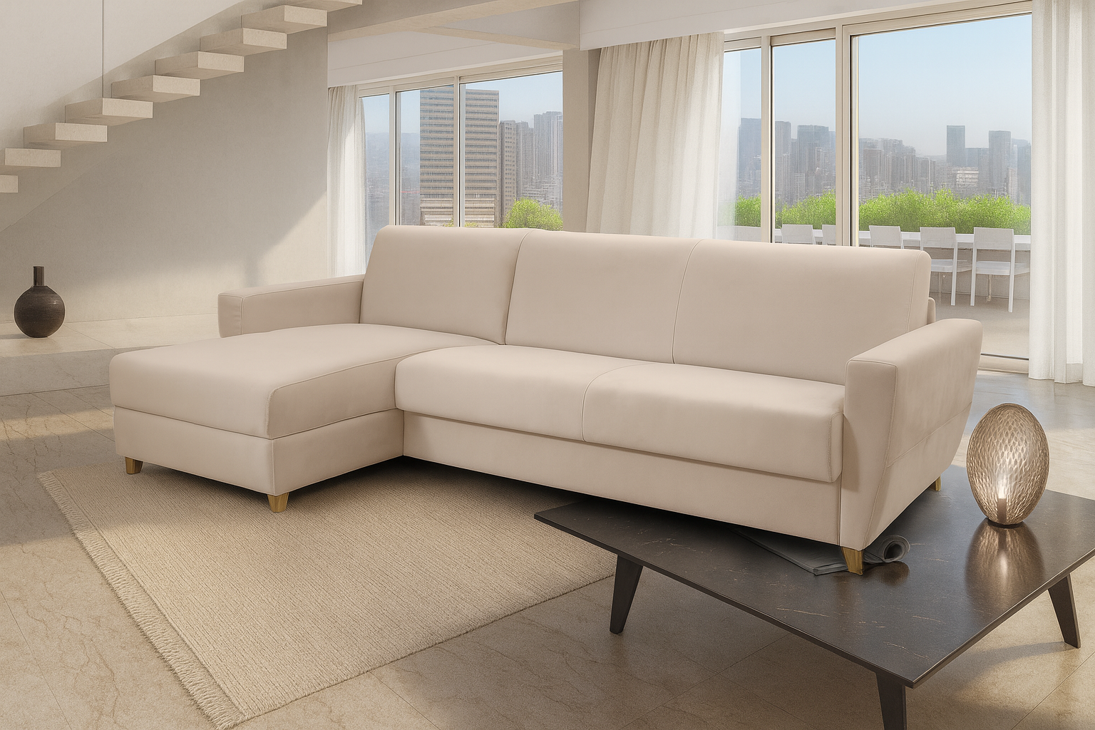 Il divano-letto BL009 Angolare dallo stile moderno con braccioli sottili e bordino decorativo a contrasto. Dotato di penisola versatile, offre comfort e stile in un’unica soluzione, ideale per ambienti contemporanei e spazi multifunzionali.