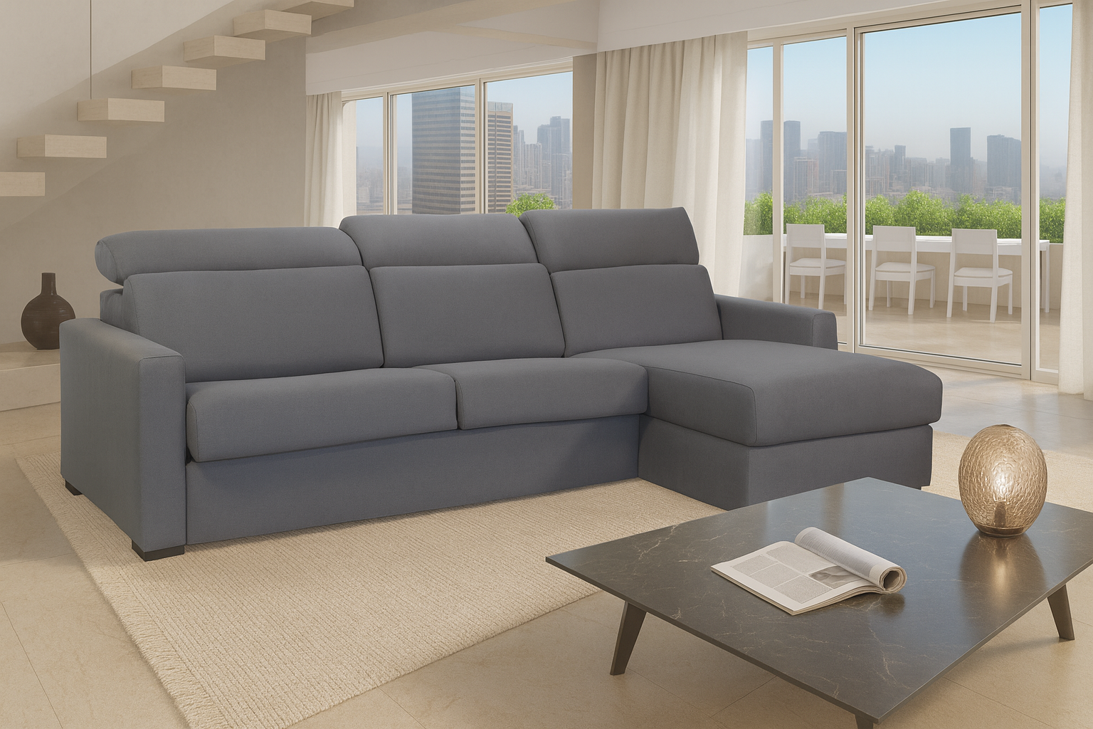 Il divano-letto angolare BL012 mescola eleganza e funzionalità in un unico arredo. Rivestito in tessuto resistente, offre ampio spazio grazie alla sua configurazione con chaise-longue. È la soluzione ideale per chi cerca comfort di giorno e praticità di notte poiché è dotato di sistema letto integrato e vano contenitore.
