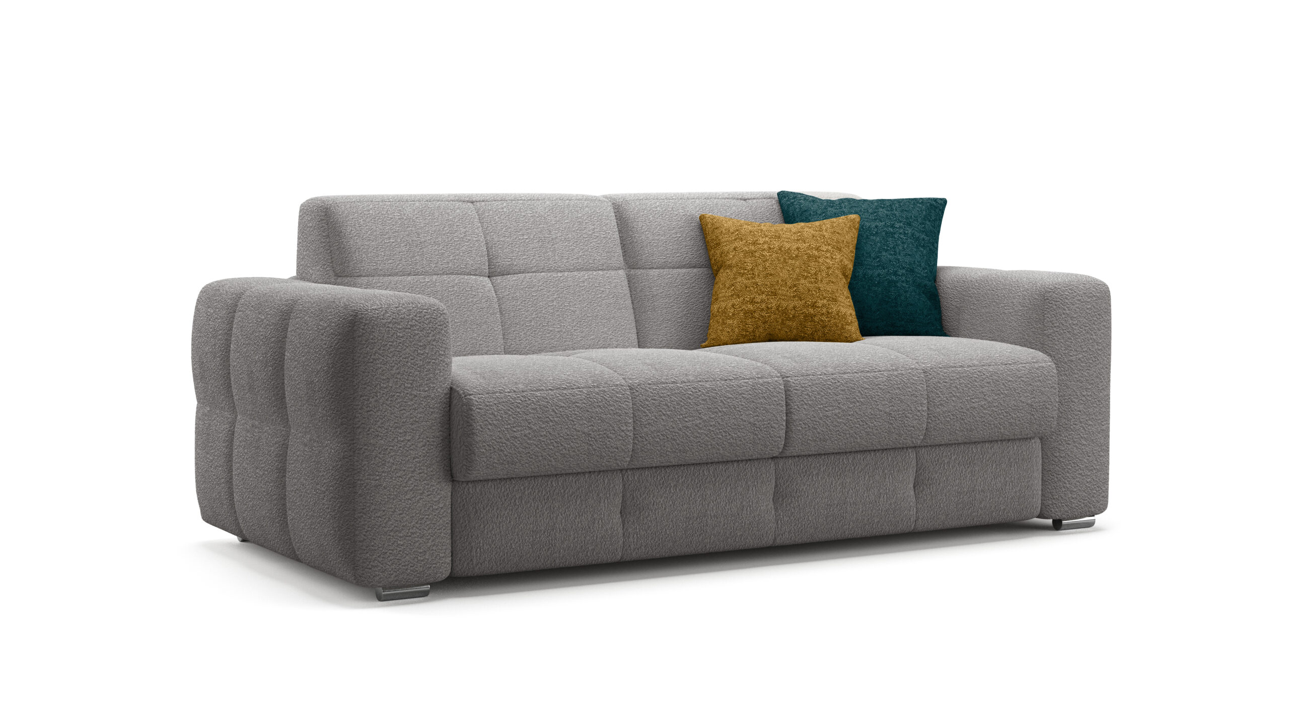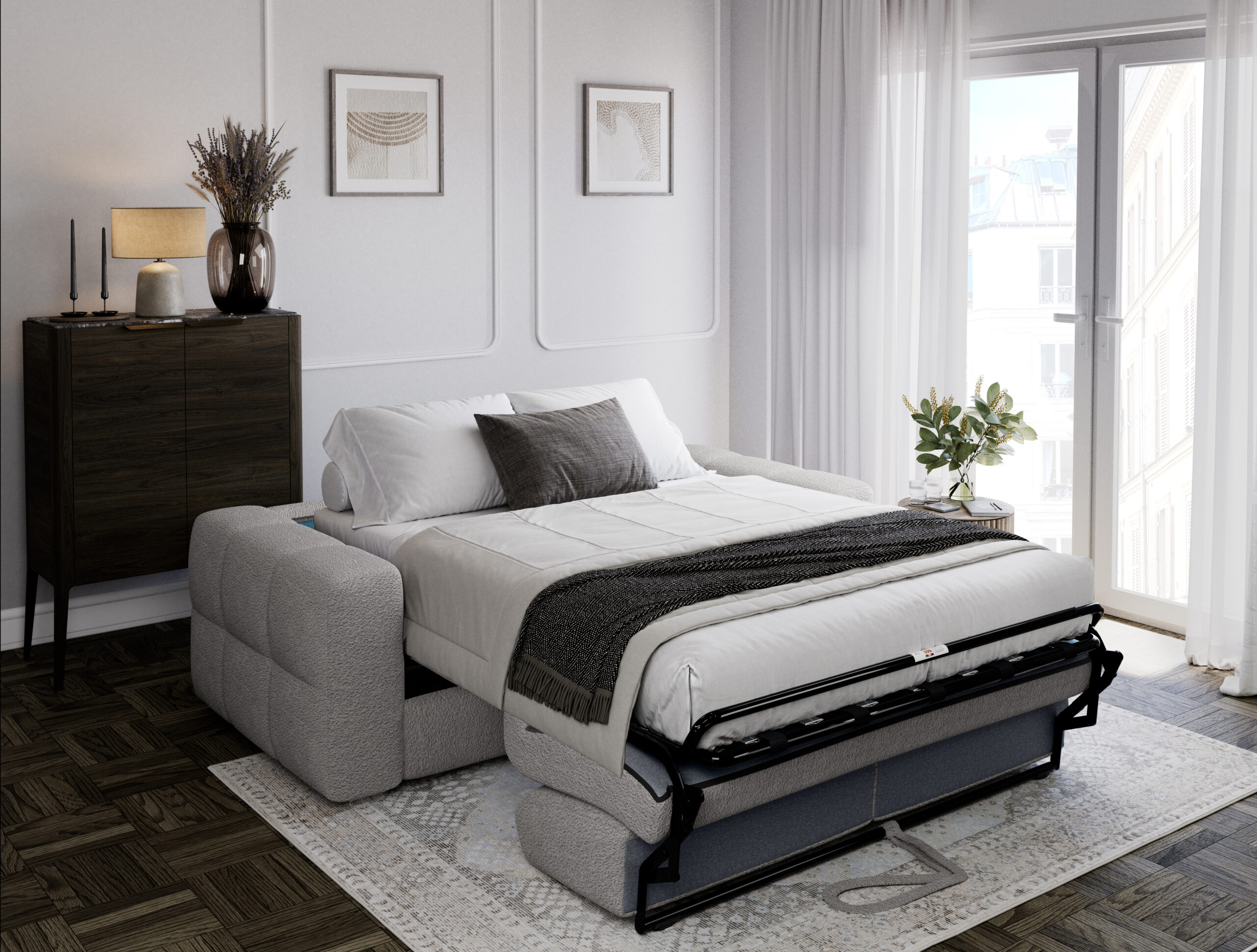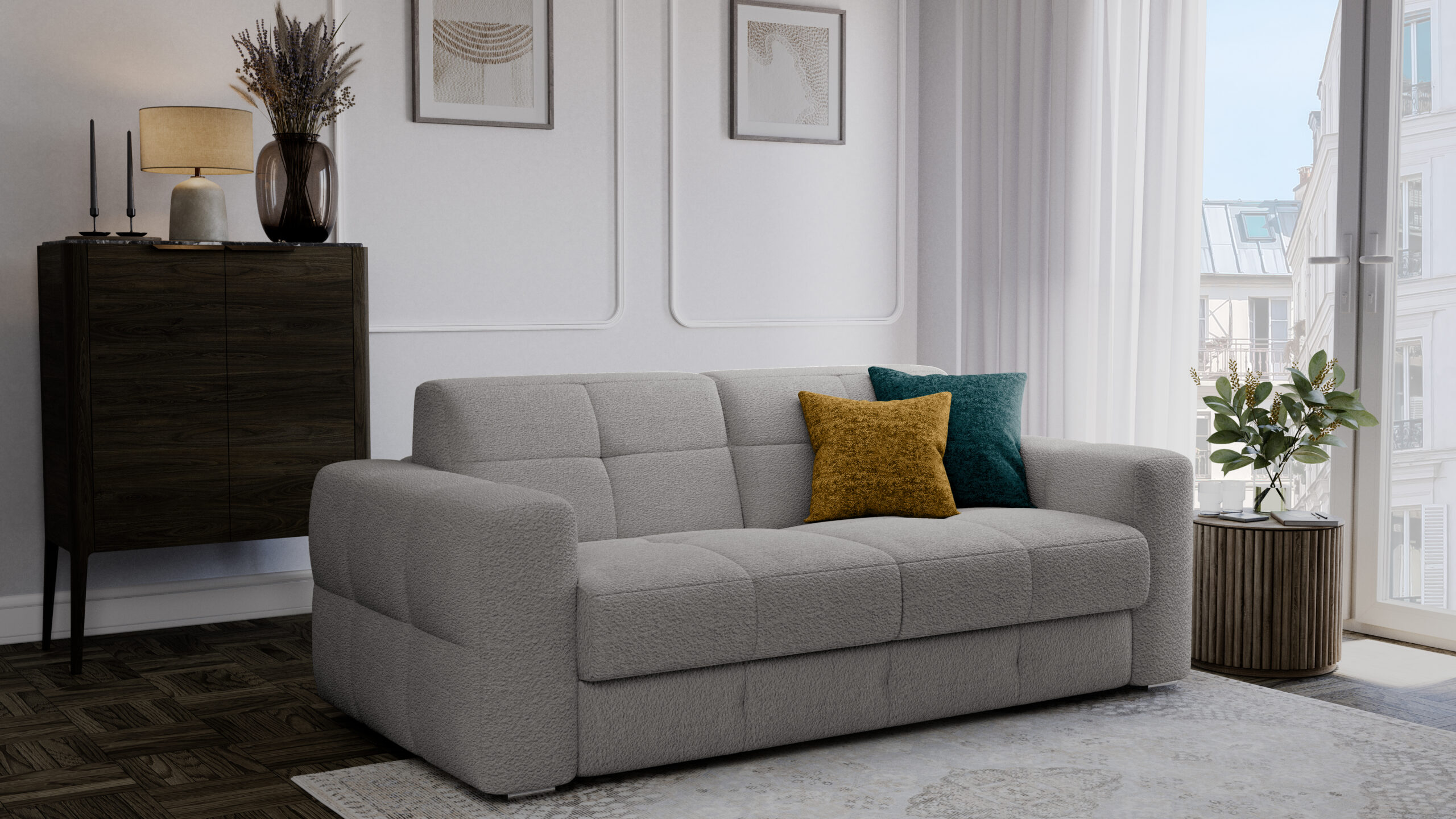 Il divano-letto Cesar è un modello dal design elegante e contemporaneo, caratterizzato da linee pulite e una struttura solida. È pensato per arredare camere moderne, combinando funzionalità e raffinatezza.