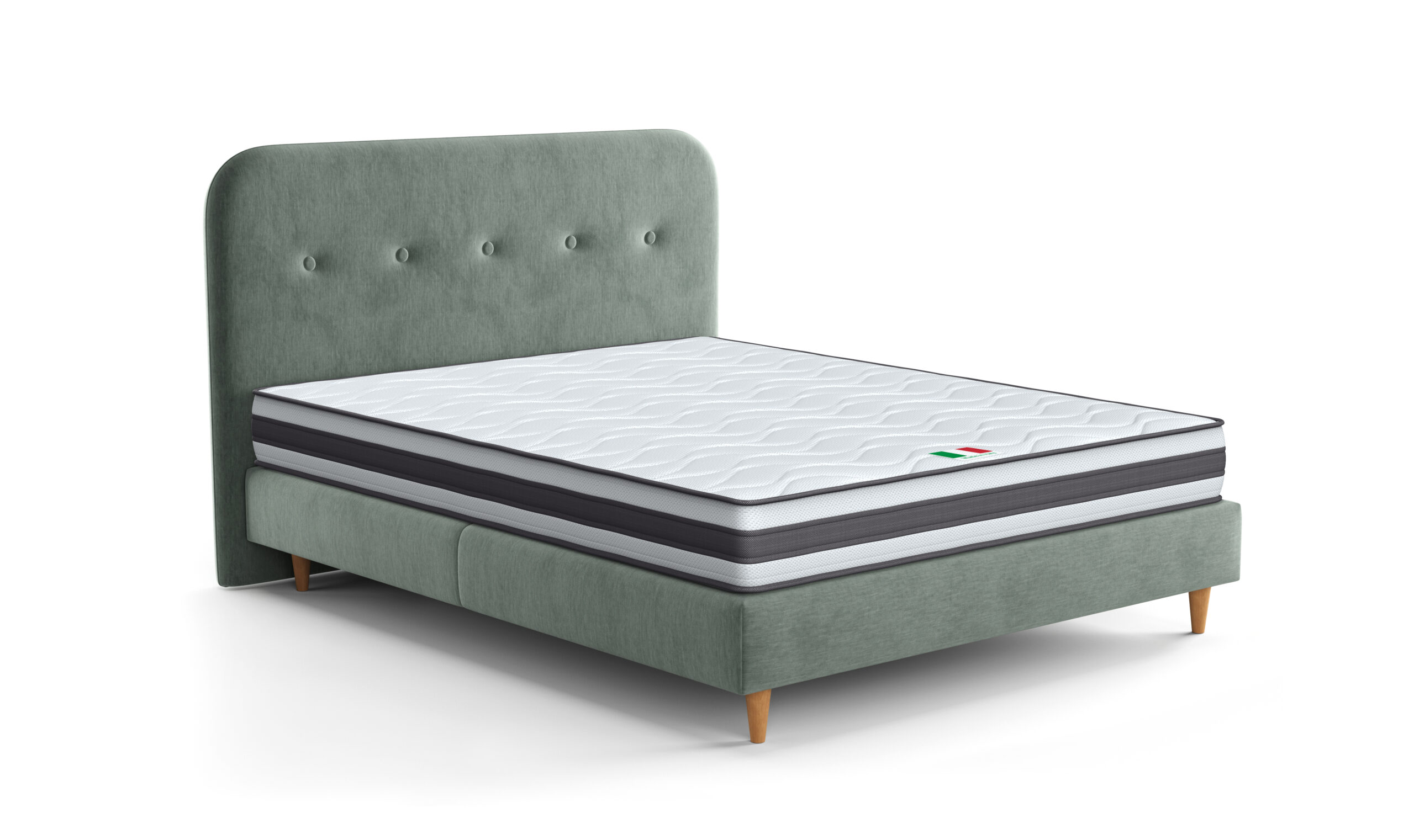 Il letto Torino in tessuto color menta unisce un design moderno e personalizzabile a un tocco di freschezza vibrante. Ideale per chi cerca uno stile contemporaneo e accogliente.