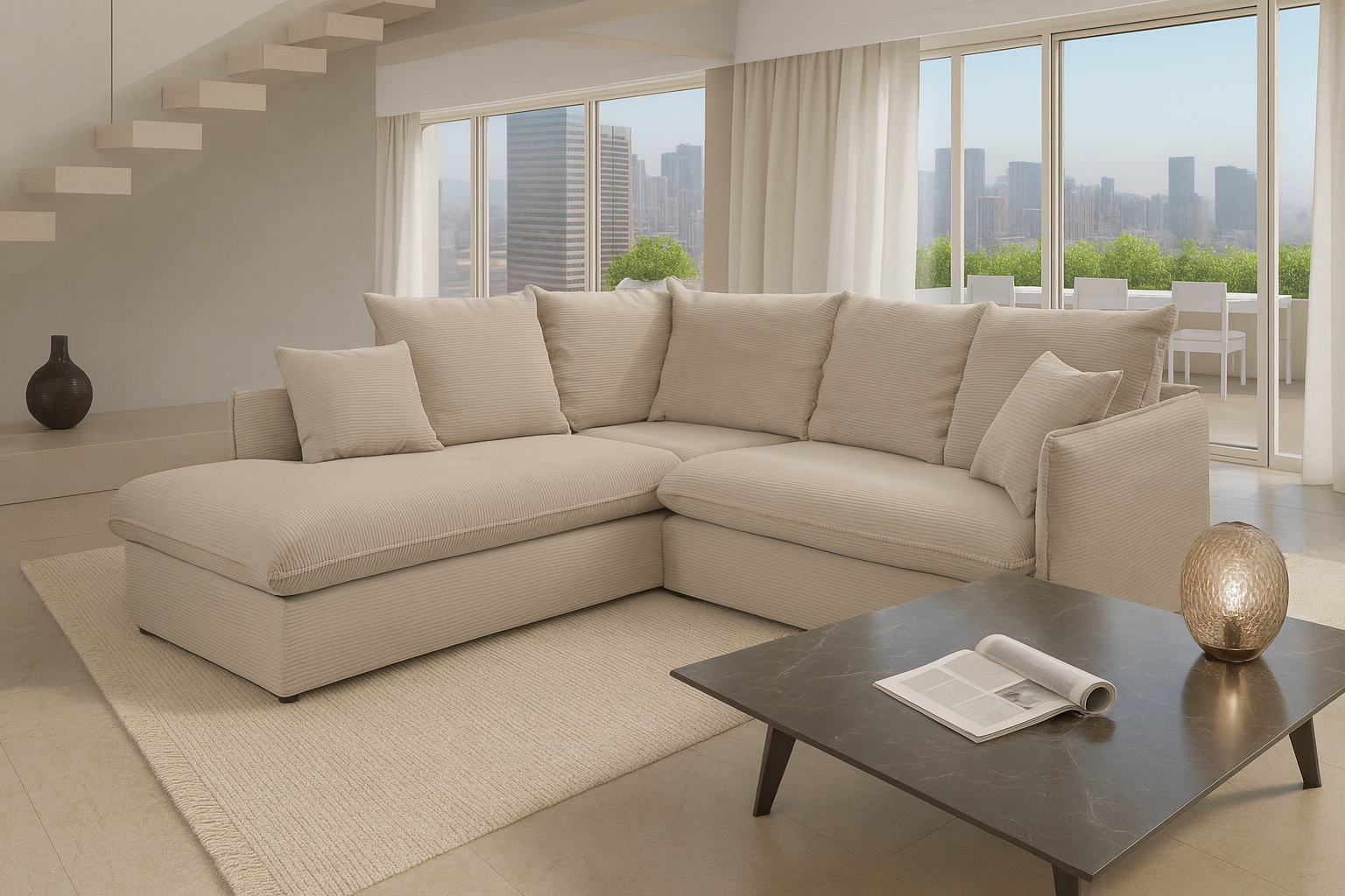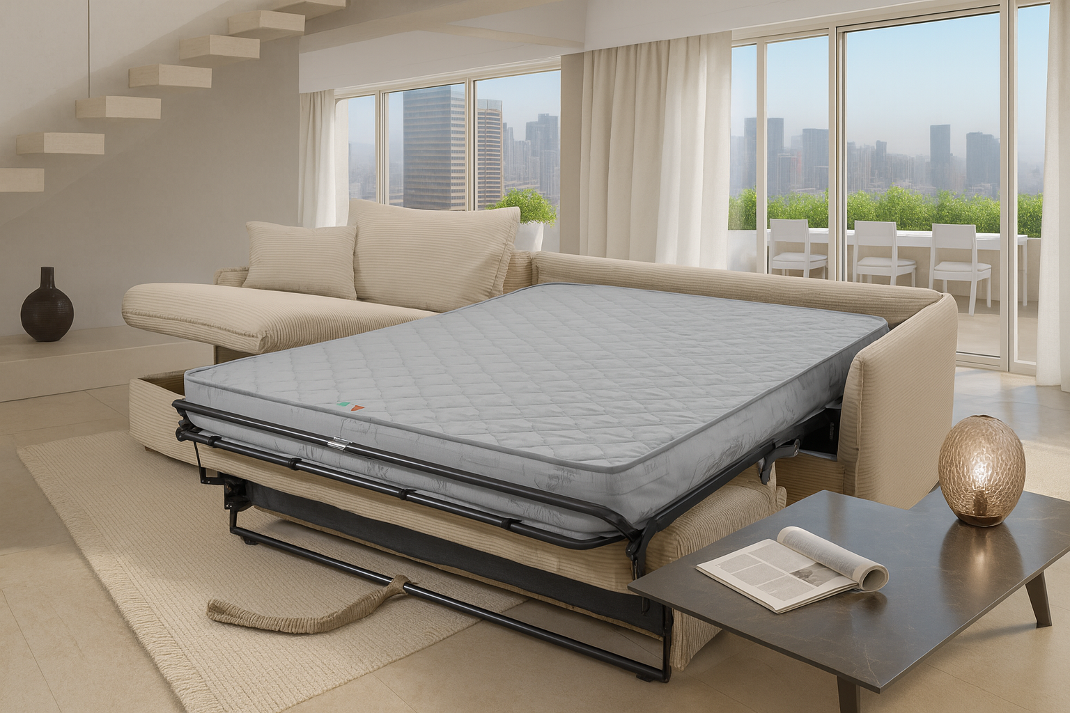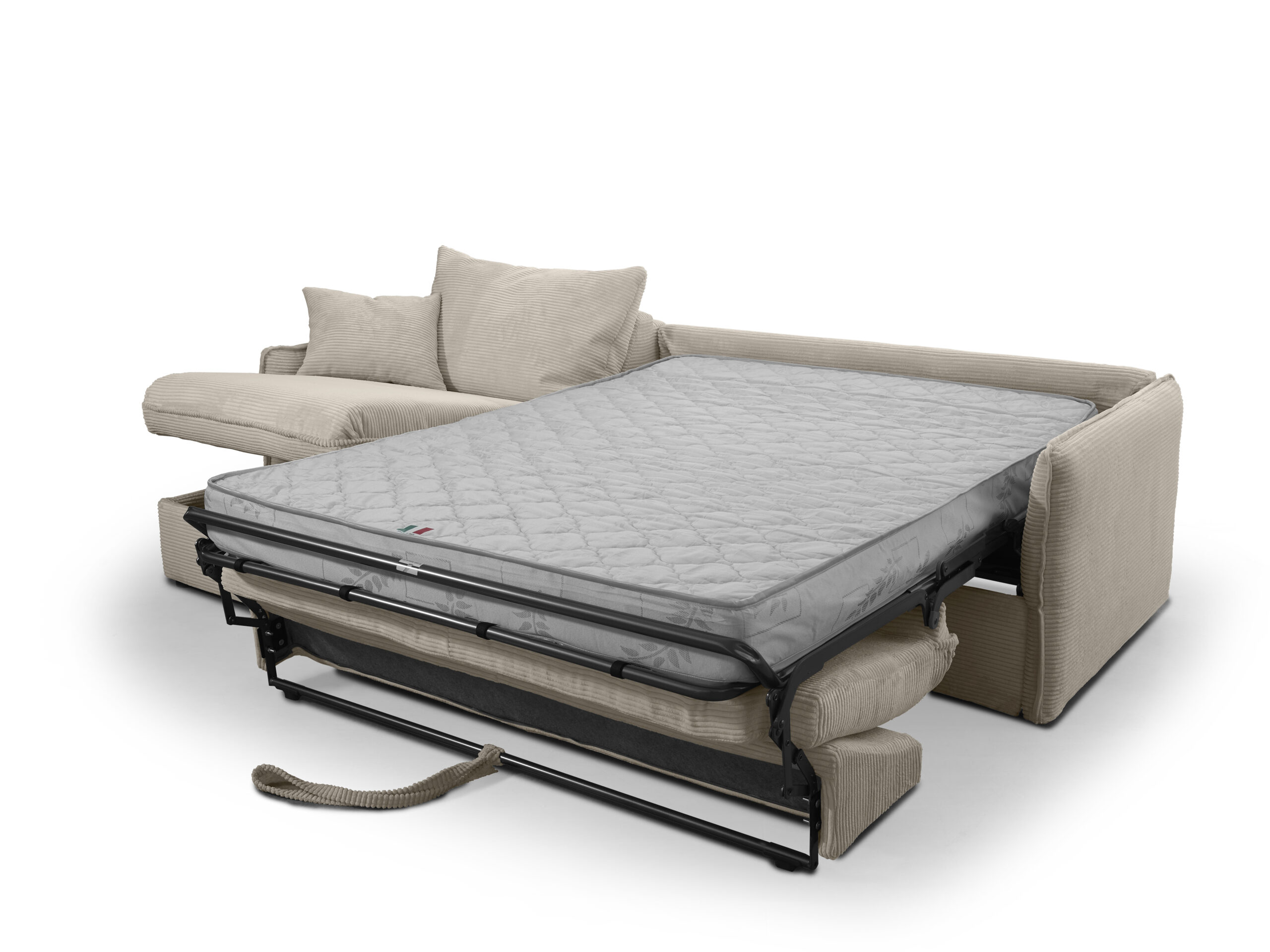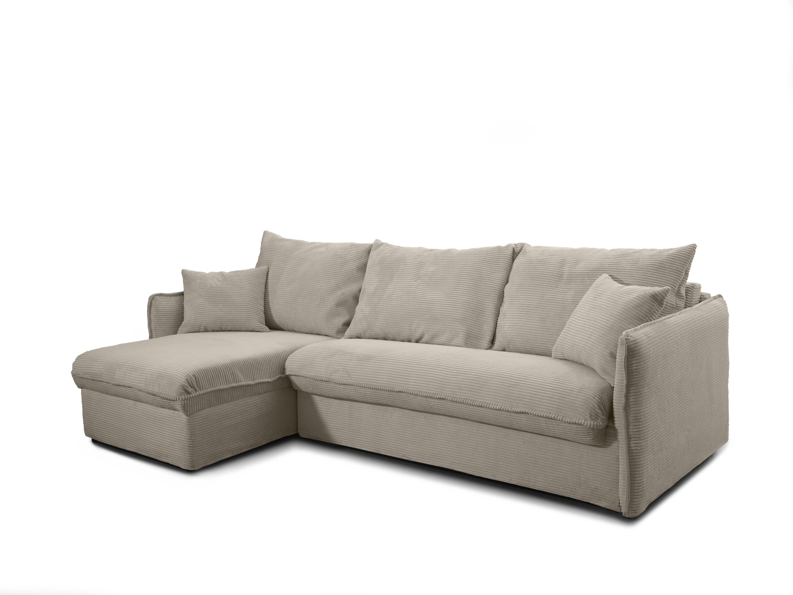Il divano-letto Mika angolare unisce design moderno e funzionalità, con un’ampia seduta ad angolo e un letto facile da aprire, offrendo comfort ottimale e ottimizzazione dello spazio.