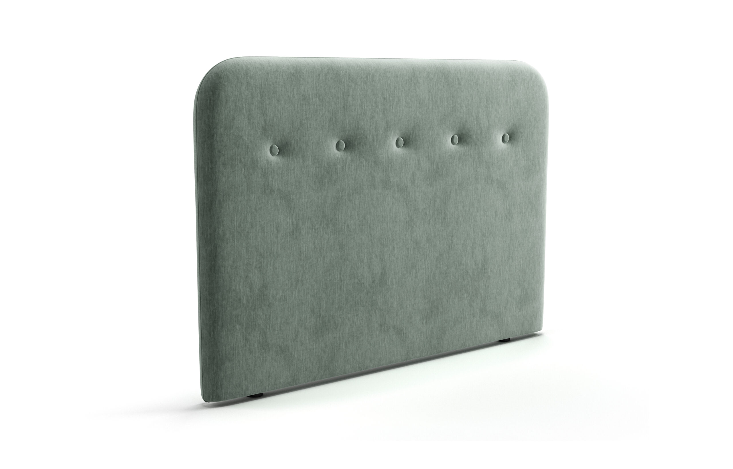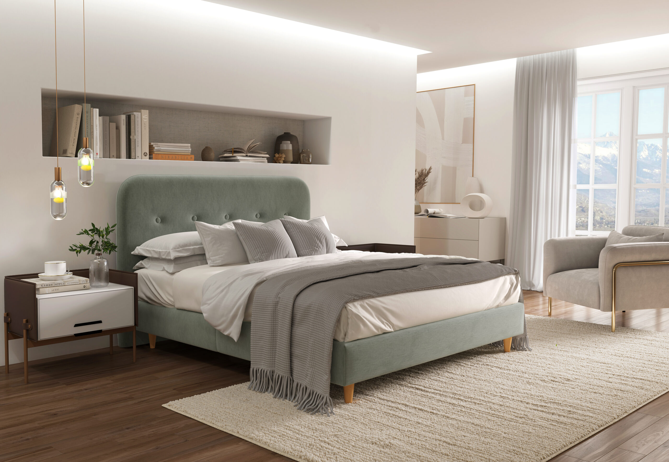 Linee raffinate e stile contemporaneo. Il tessuto Etoile in tonalità menta dona freschezza e delicatezza, perfetto per creare un’atmosfera rilassante e luminosa nella zona notte.